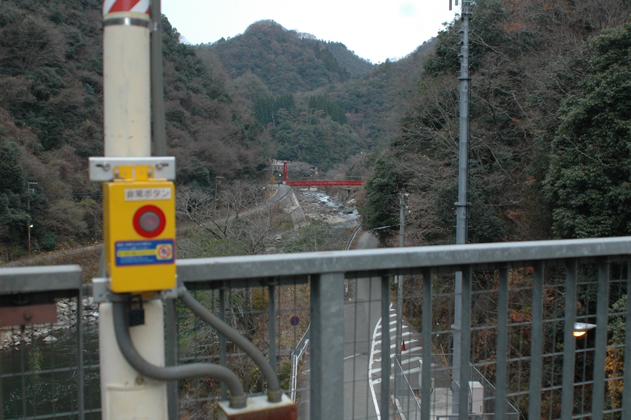 左写真は駅のホームから見た風景です。川と山だけです。渓谷です。