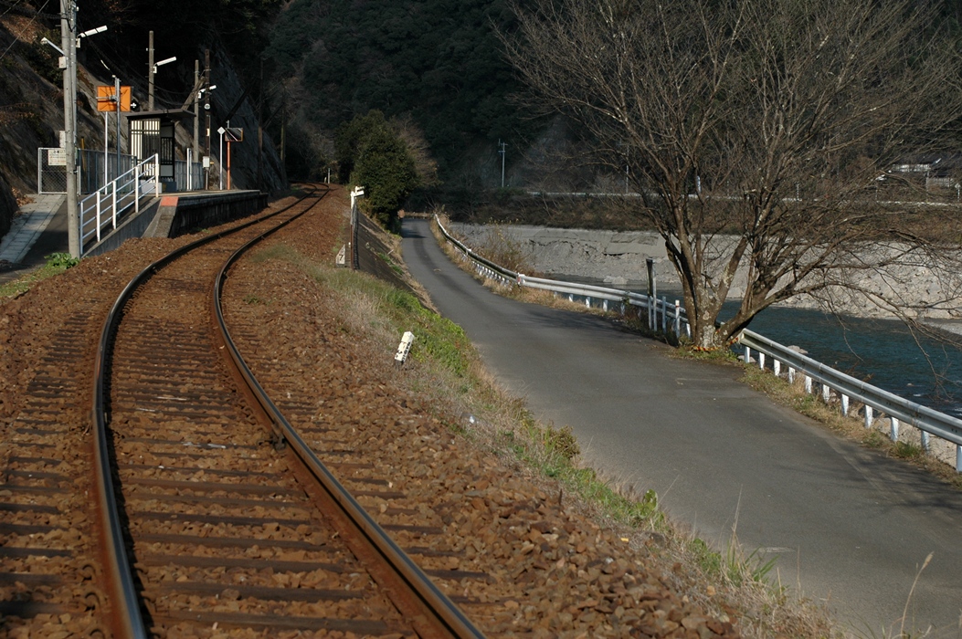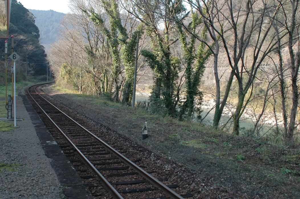 それにしても、山と川の間のほんの狭いところを線路が走っています。