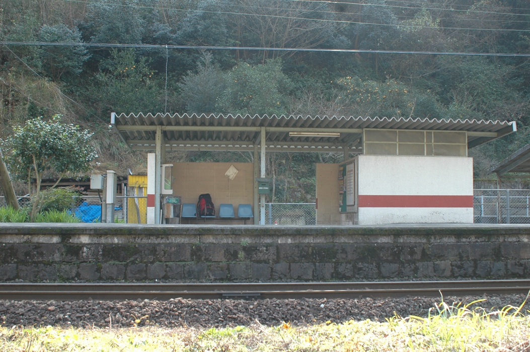 一枚目の写真見るとそれなりの駅に見えるかもしれませんが、線路側からみればこんなです。右側の囲われているところはトイレだったのですが、現在は使えません。物置状態のようでした。