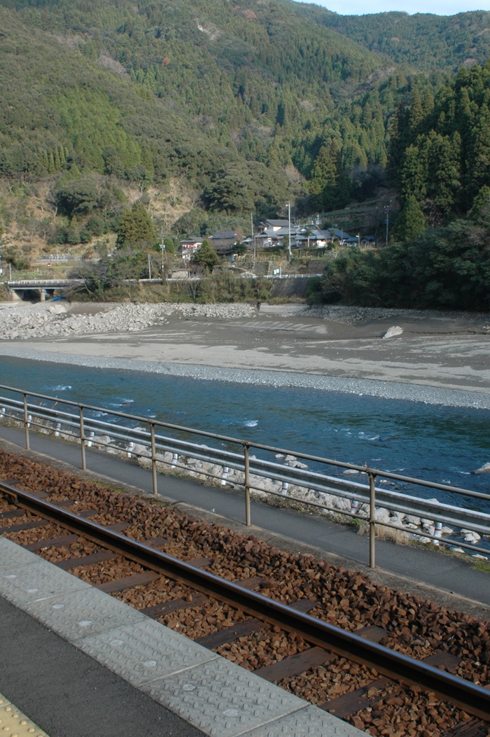 写真右側には球磨川が流れているのですが、このへんはまだ川幅があまり広くないのと、木があったりで待合室あたりからは川がよく見えません。