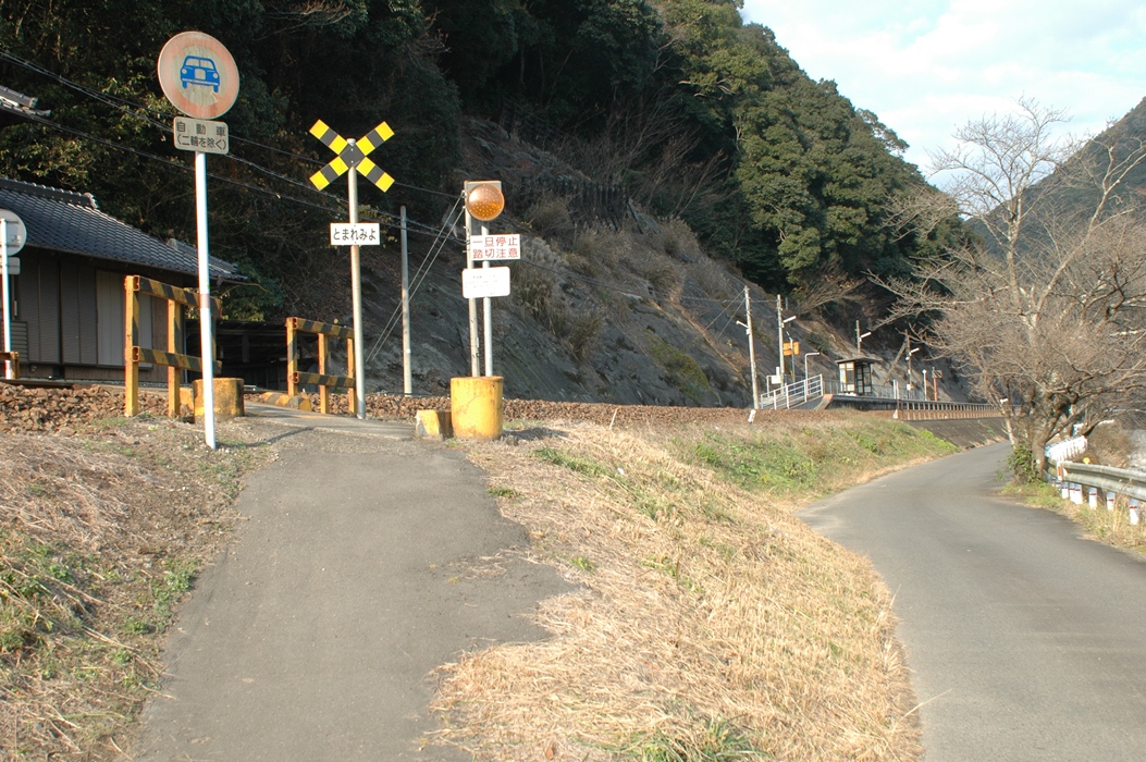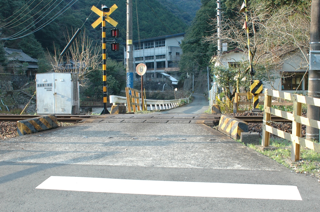 駅横の踏み切りです。20軒弱くらいの集落があるのですが、相当数が空家、または廃墟です。奥に見える大きな建物は「海路小学校」です。鉄筋コンクリートの4階建て。しかし現在生徒はおりません。とっくに廃校となっていました。
