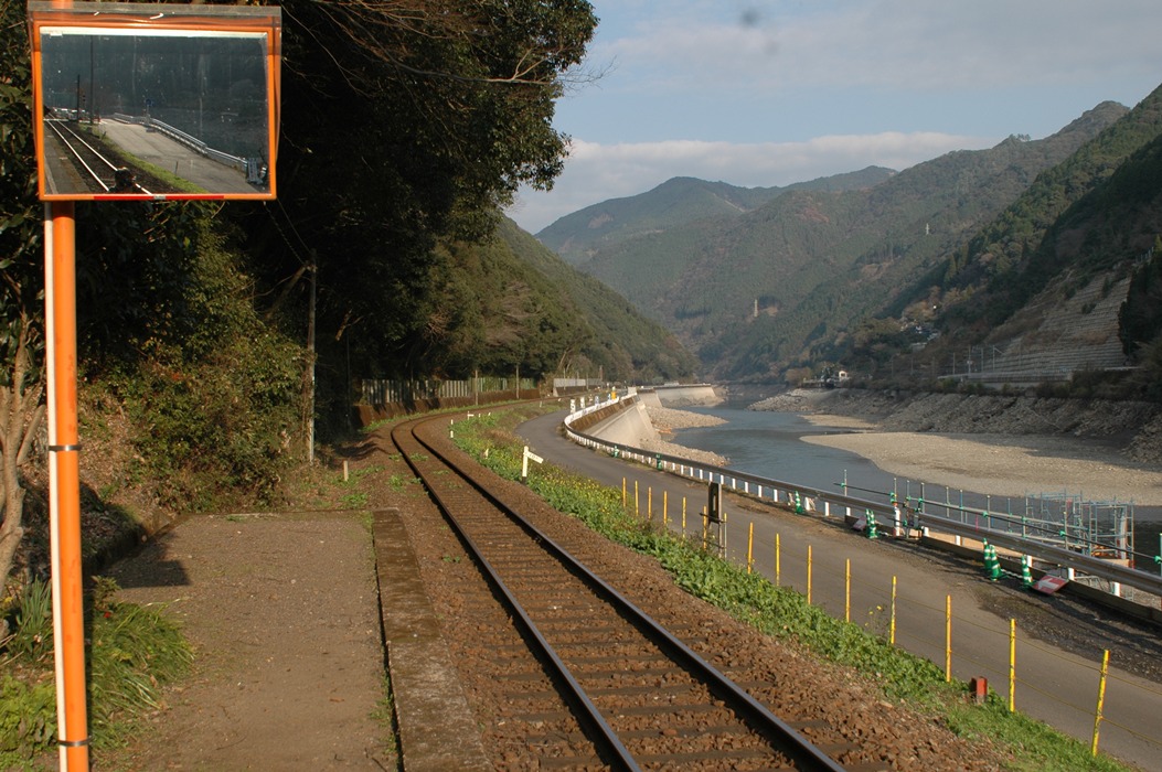 写真のカーブミラーのようなものは、ワンマン運行の気車で、運転士が後方を確認するためのものです。よくみると私が映っています。自分を入れたかったんですが、結構むずかしいです。