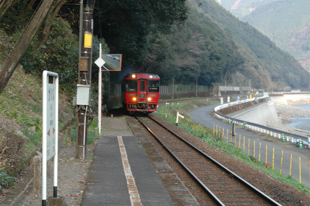 海路駅を九州横断特急が通過しようとしています。