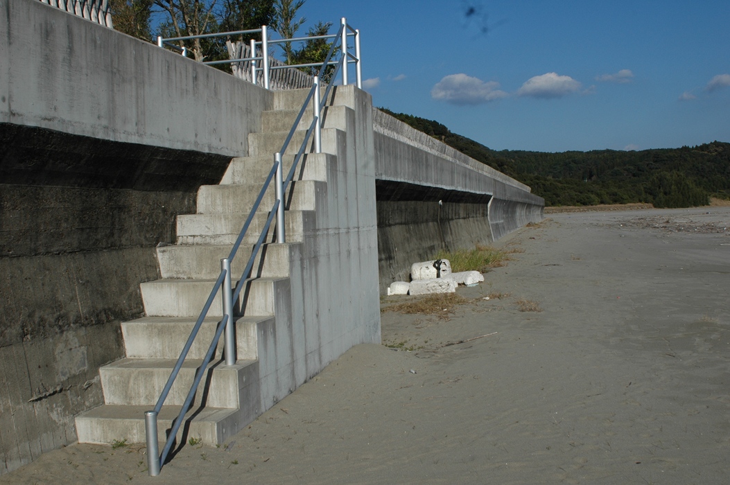 駅に海水浴のポスターがあったので、私も海まで行ってみました。距離はちかいんですが・・・行くのはたいへんでした。次の写真のように堤防がつくられていまして、砂浜におりには、二つある階段に出るか、堤防の端まで行って回ってくるかしかありません。わたしは階段にでる道がみつからず、堤防の端まで行ってしまいました。