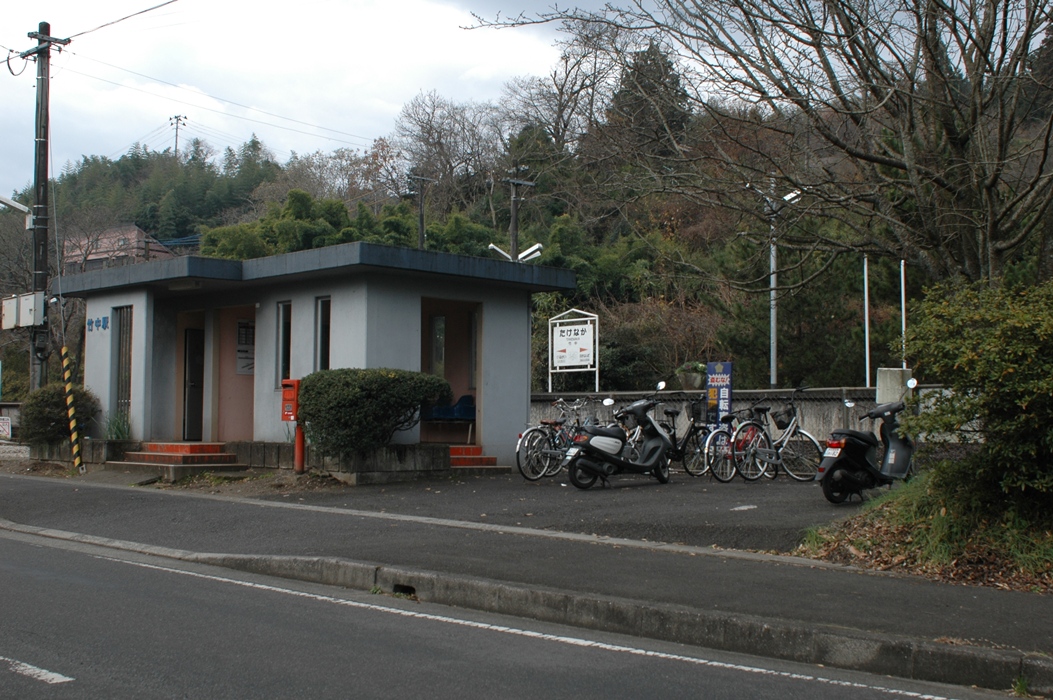 駅舎です。駅舎というか待合室ですね。コンクリート製でしょうか。横にあったトイレはつぶされいて物置状態でした。駅前の道路は県道のようです。時々車が通ります。散歩、ウォーキングの人も通ります。駅にはバイクや自転車がそこそこの数、駐輪されています。
