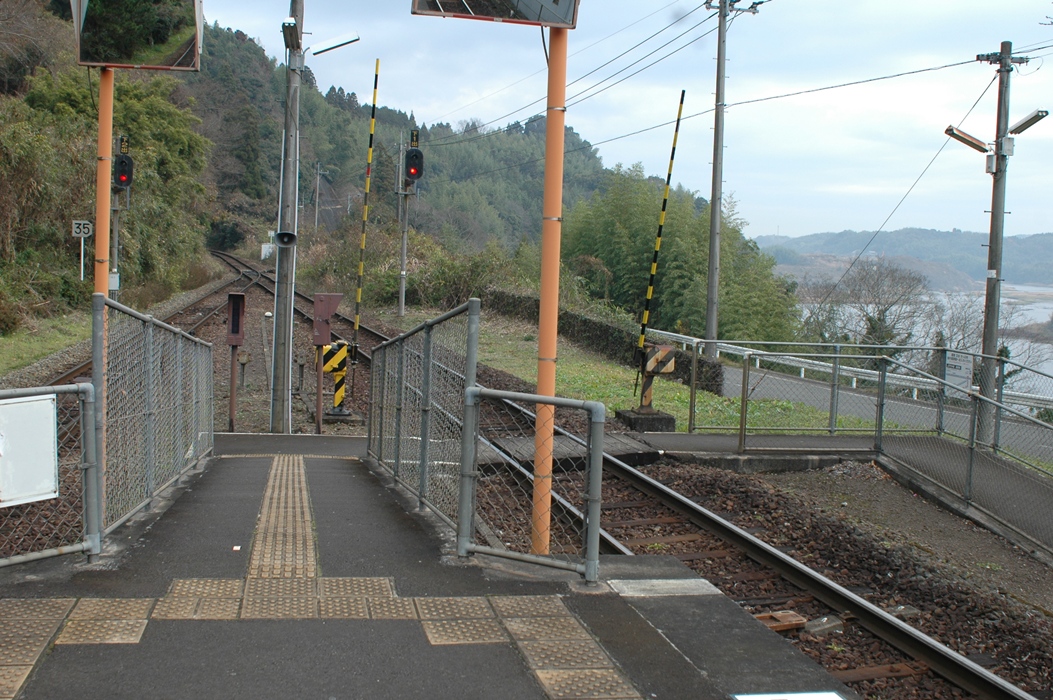 ホームの端のほうへ来ると川がみえます。この写真だとそれなりにいい雰囲気なんですが、なにがだめかというと竹やぶの向こう側の対岸に大きな工場があって、