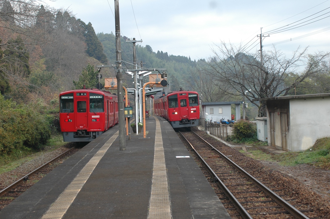 列車交換中。左が私が乗ってきた気車です。ここで右側の熊本行の到着を待っていました。