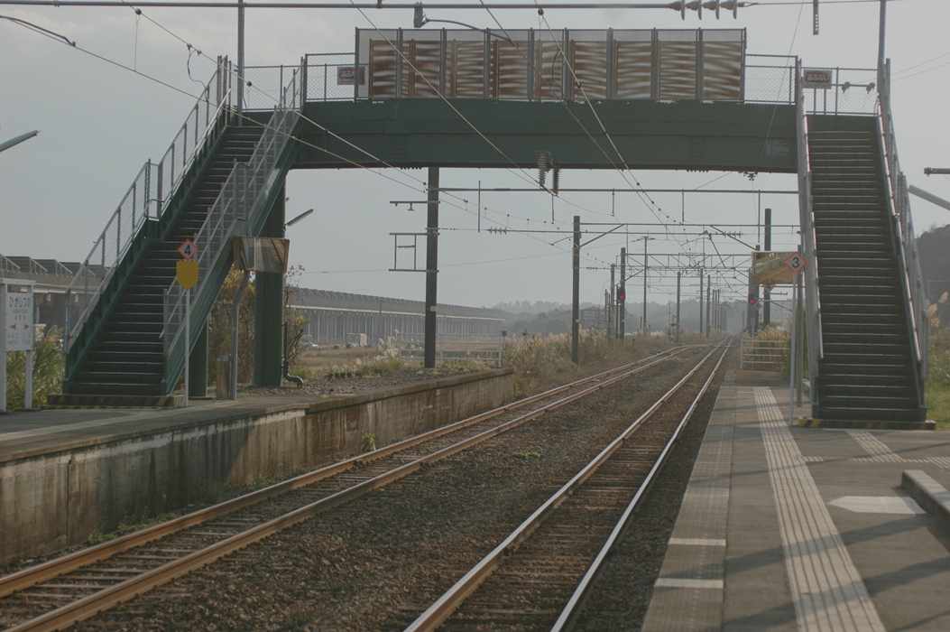りっぱな跨線橋があります。列車交換駅です。リニア実験線が延々と伸びています。しかし、なにかへんですね。