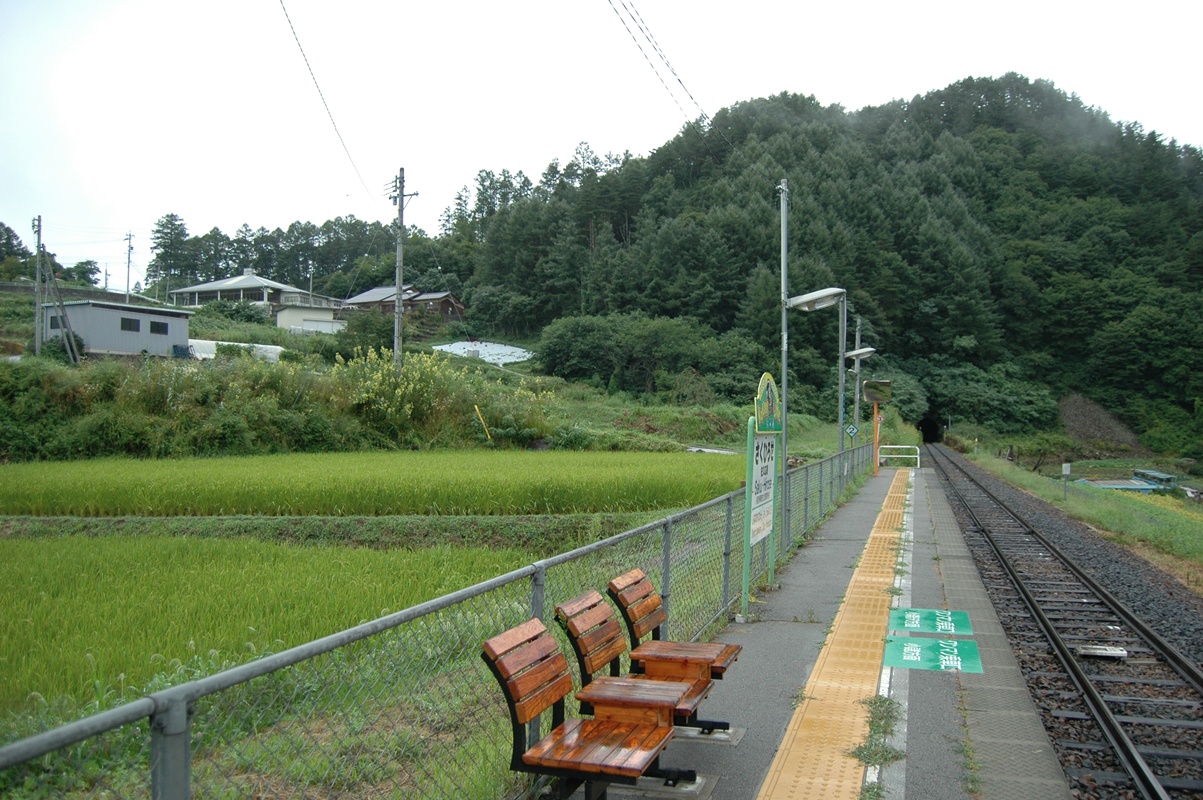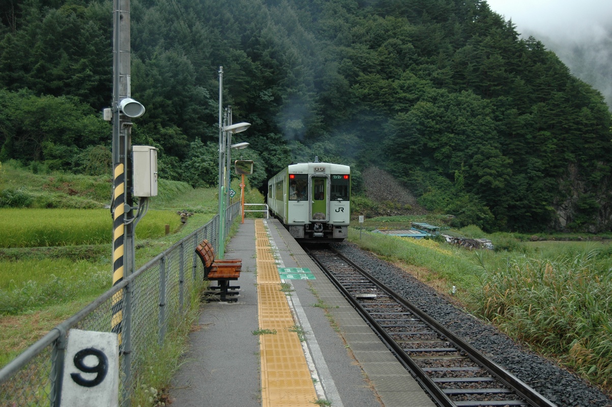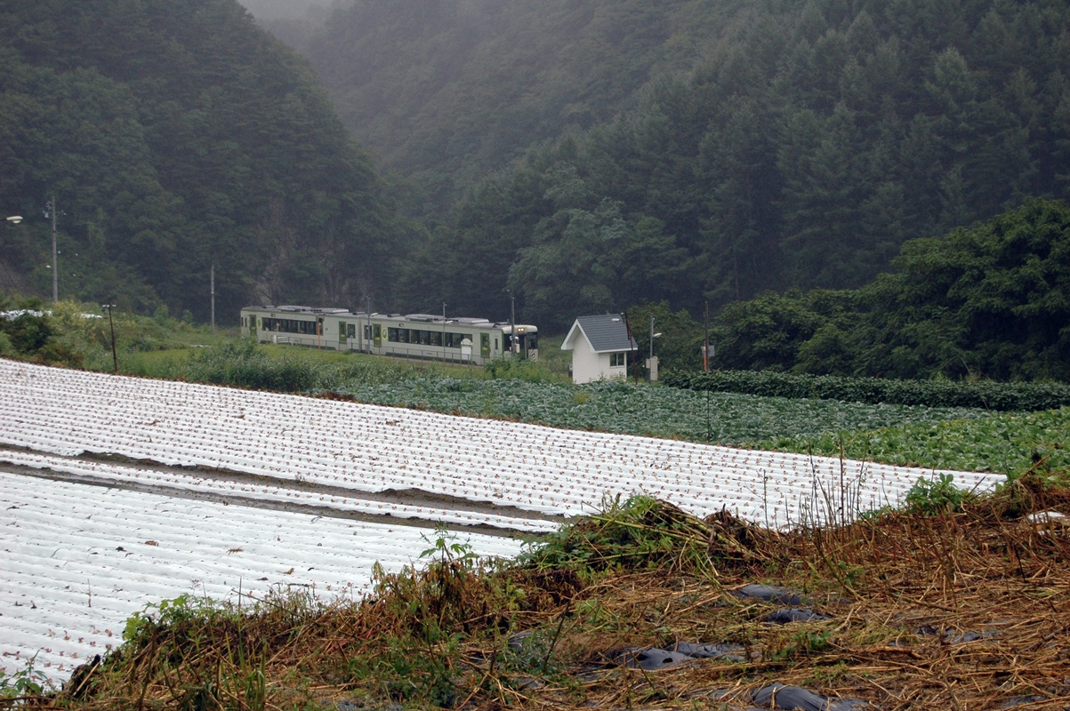 乗ってきた列車が小諸方面へ去ってゆく。相変わらずの小雨模様。