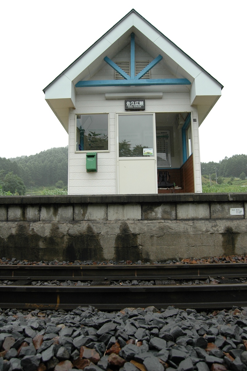 水色が結構なアクセントになっている。 広さは幅2.5m奥行き1.5mくらいか。狭い。この座布団がすごいね。地元の方が作られたのだろうが、ベンチ全面に渡る一枚物である。「広瀬長寿会」という方々がこの駅の面倒を見ていてくださるらしい。写真は掲載しないが、窓の上部にはJRからの感謝状が、何枚も額に入れられて飾られているのだ。