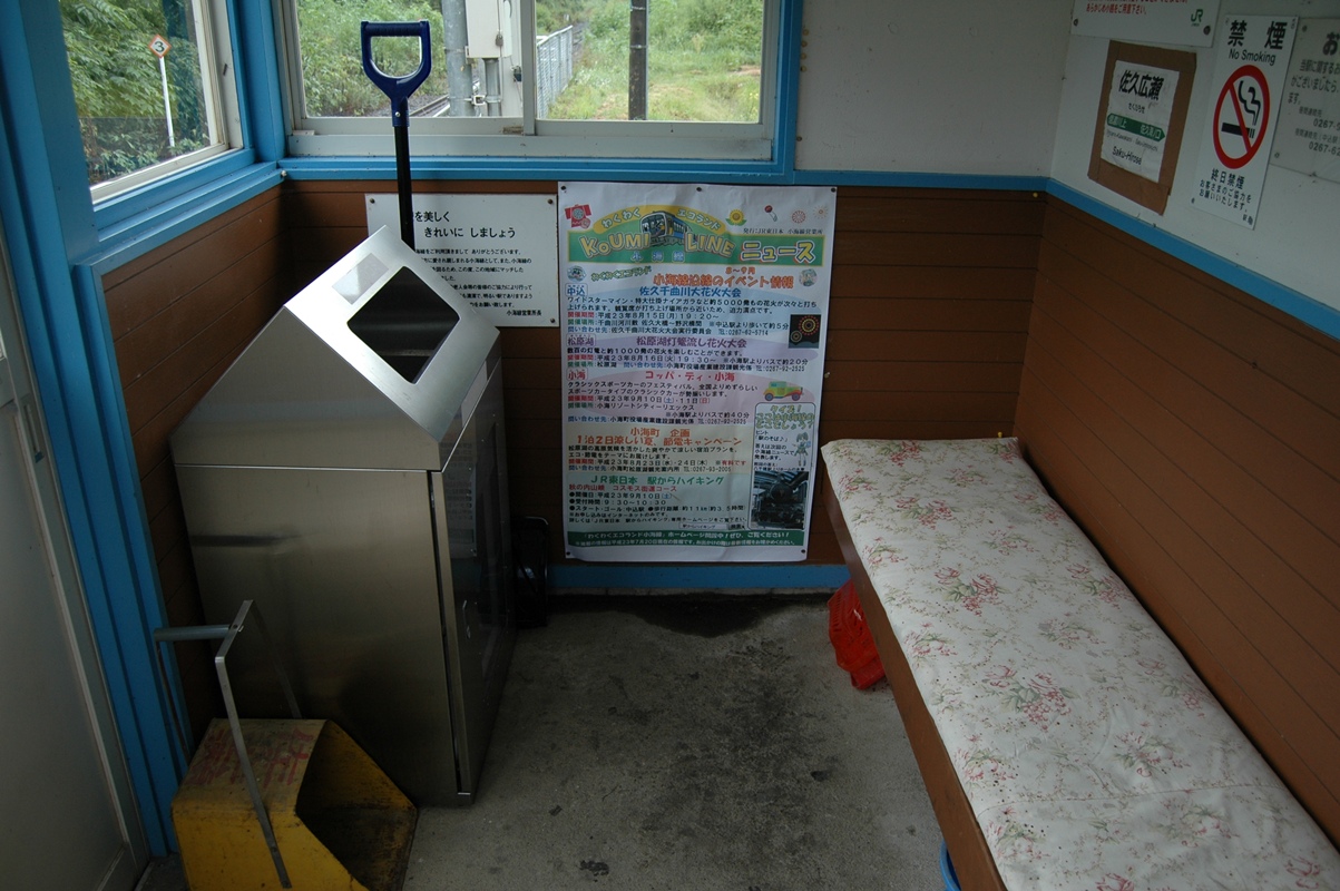 小淵沢方向。小さい待合室。しかし、あまり秘境駅の待合室っぽくはない。待合室の大きさに対して屋根がやけに大きい。