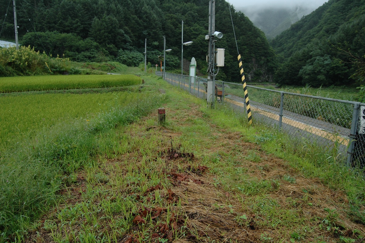 ホーム横、駅入り口または待合室に至る道。「道」というか「あぜ道」である。写真の先のほう、ホームのはずれあたりまではアスファルトの道があり、車も来れるのだが、その先はこの道である。砂利道ですらない。うーむ。