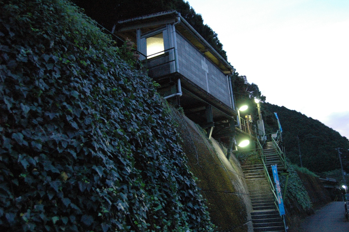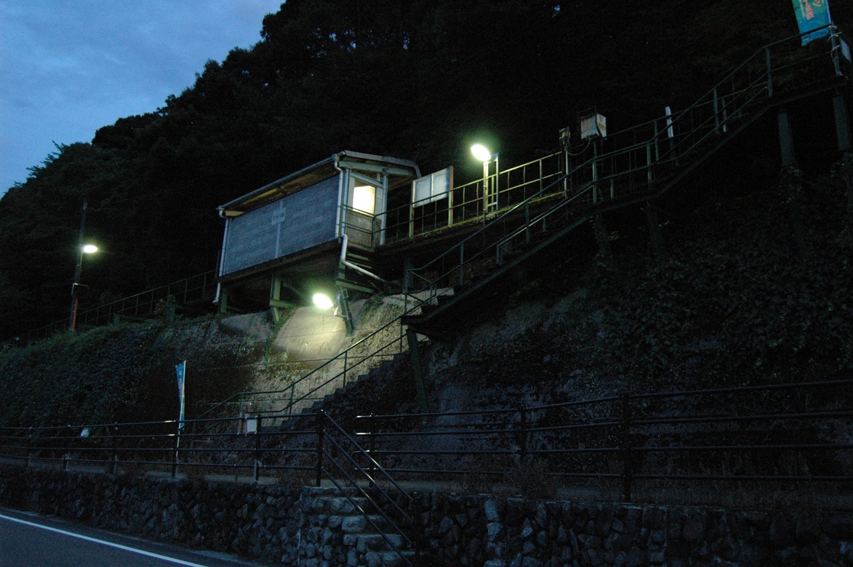 明かりをみれば十数軒くらいだろうか。写真右奥のほうにある三角屋根がトイレ。駅から数十メートル離れている。実際はぼぼ真っ暗闇。なにも見えないので、トイレまでは行ったが橋は渡ってみなかった。