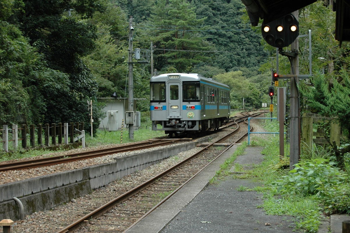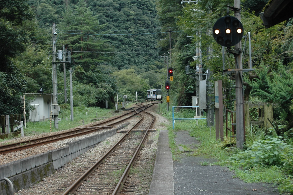 川沿いなのだから谷なわけで、駅からは東西どちらに向かおうと登り坂である。写真後方に木屋床(こやとこ)という集落に向かう道がある。道といっても登山道のような道であるが。木屋床集落までは地図でみれば直線距離で1kmもないようだが、なにしろうねうねと坂道を行くわけで30分くらいかかるらしい。