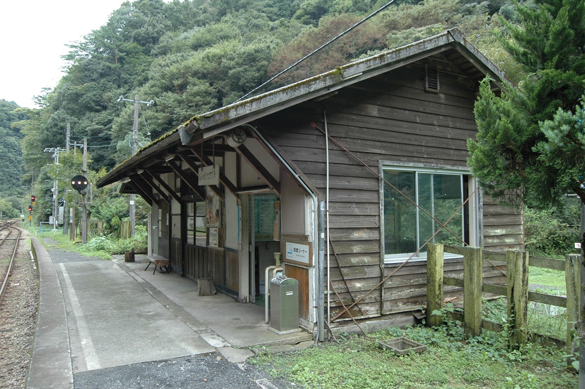 駅舎。屋根に苔が生えている。駅舎は昭和25年築だそうな。