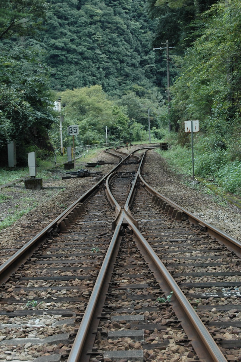 スイッチバック 線路。手前右側、ホームへ。奥左、スイッチバック引込み線。