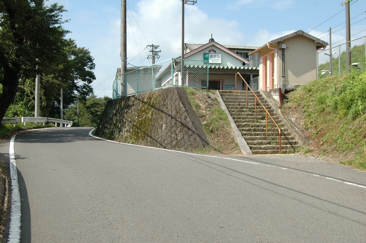 駅前の道を下ってみた。振り返り駅を見たところ。待合室やホームからは人家がまるで見えないのだが、この先少し下ると数軒の集落があった。駅から300メートルくらいだろうか。意外に近い。