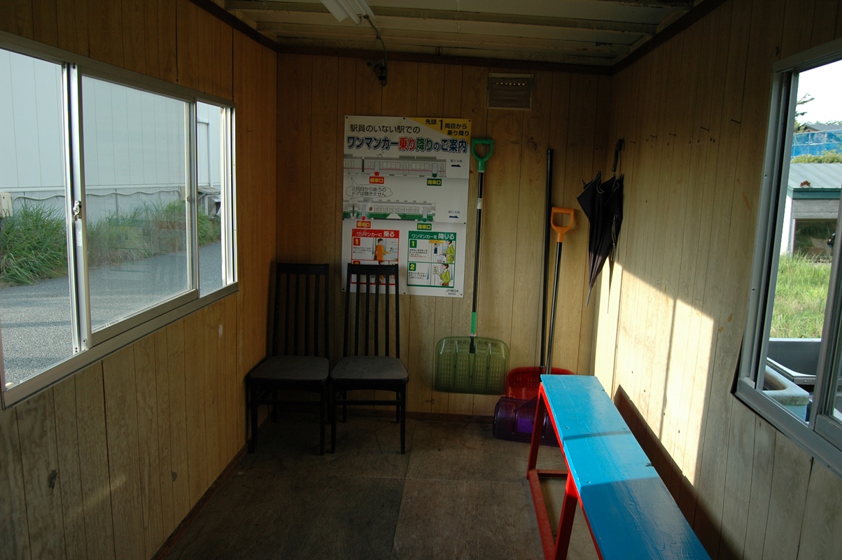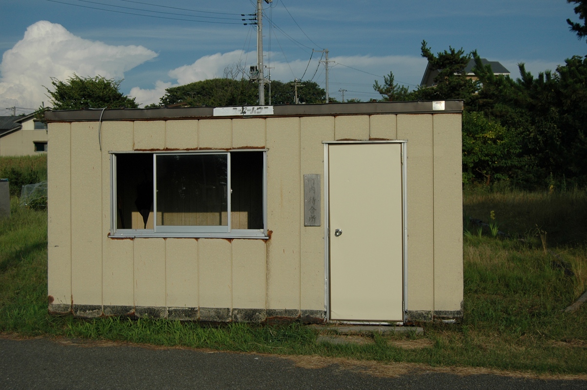 そのプレハブ。拡大していただければわかるが、入り口横の看板には「町内待合所」と書かれている。駅の待合所とはかかれていない。そもそも立地からしてJRの敷地とは思えない。おそらく地元の町内会などが設置したものであろう。小屋の後ろに家が見えるが、実は松の防砂林だか防風林だかの向こう側にはそこそこな集落があるのだ。そういう意味ではあまり秘境駅っぽくないのだが、次の写真。