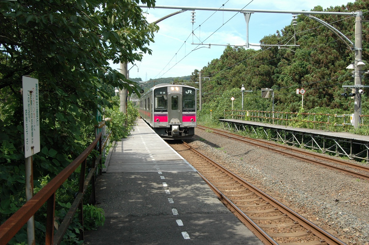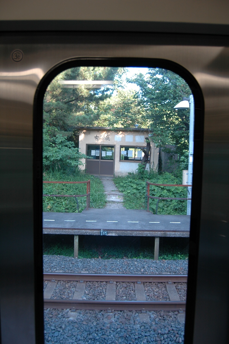 この写真は、8月9日、酒田発 5:48で折渡へ向かう列車の中から撮ったものだ。ここでこのドアが開いてくれればなぁ、と思えども、無情に列車は通過していった。