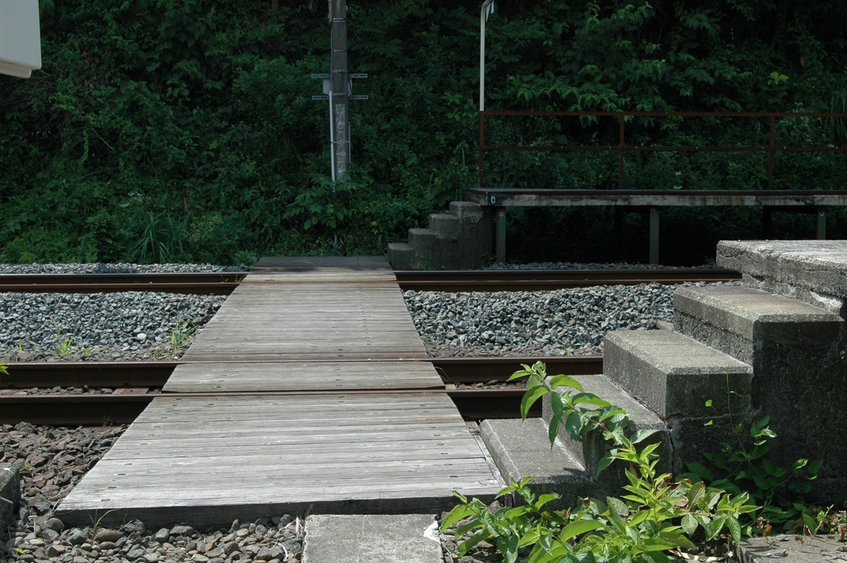 ホーム端の踏み切り。拡大してみていただければわかると思うが向こう側の電柱に「早目出場 左右確認」と書かれている。信号場時代の作業員への注意と思われる。