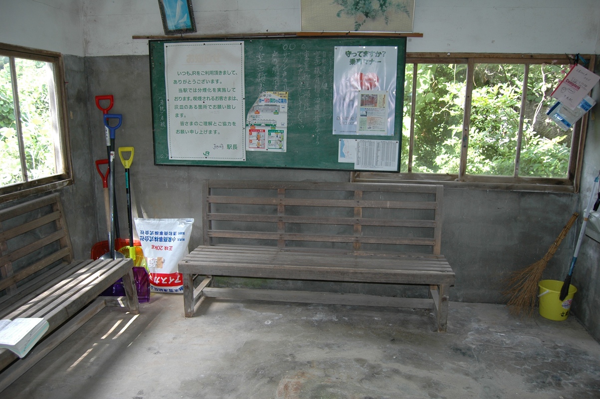 右隅、窓の上に駅ノートがぶら下がっている。黒板には張り紙の他、チョークで注意事項が書かれている。それなりにきれいだ。あまり人のこない駅の場合、汚れはほとんど虫の死骸だが、見当たらなかった。