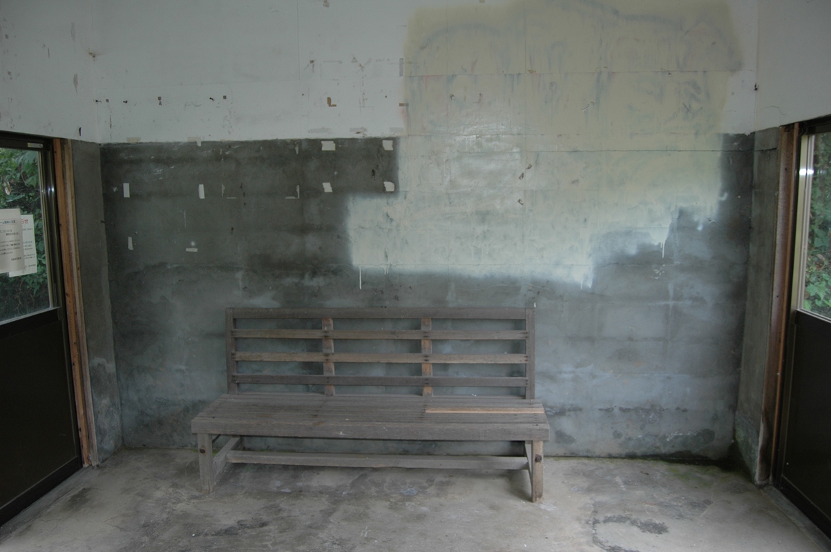 反対側。ブロックむき出し。ひどい落書きがあったと見え、ペンキで消されている。椅子もぼろいがちゃんと補修されているのがうれしい。