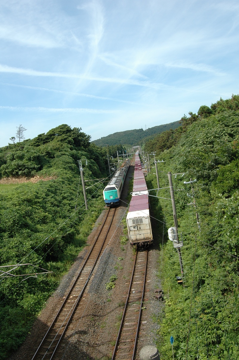 長--い貨物列車が酒田方向(写真手前)から入ってきて駅に停車した。列車交換かと思って構えると、青い列車がやってきた。12:57 秋田発 新潟行 特急いなほ10号だ。