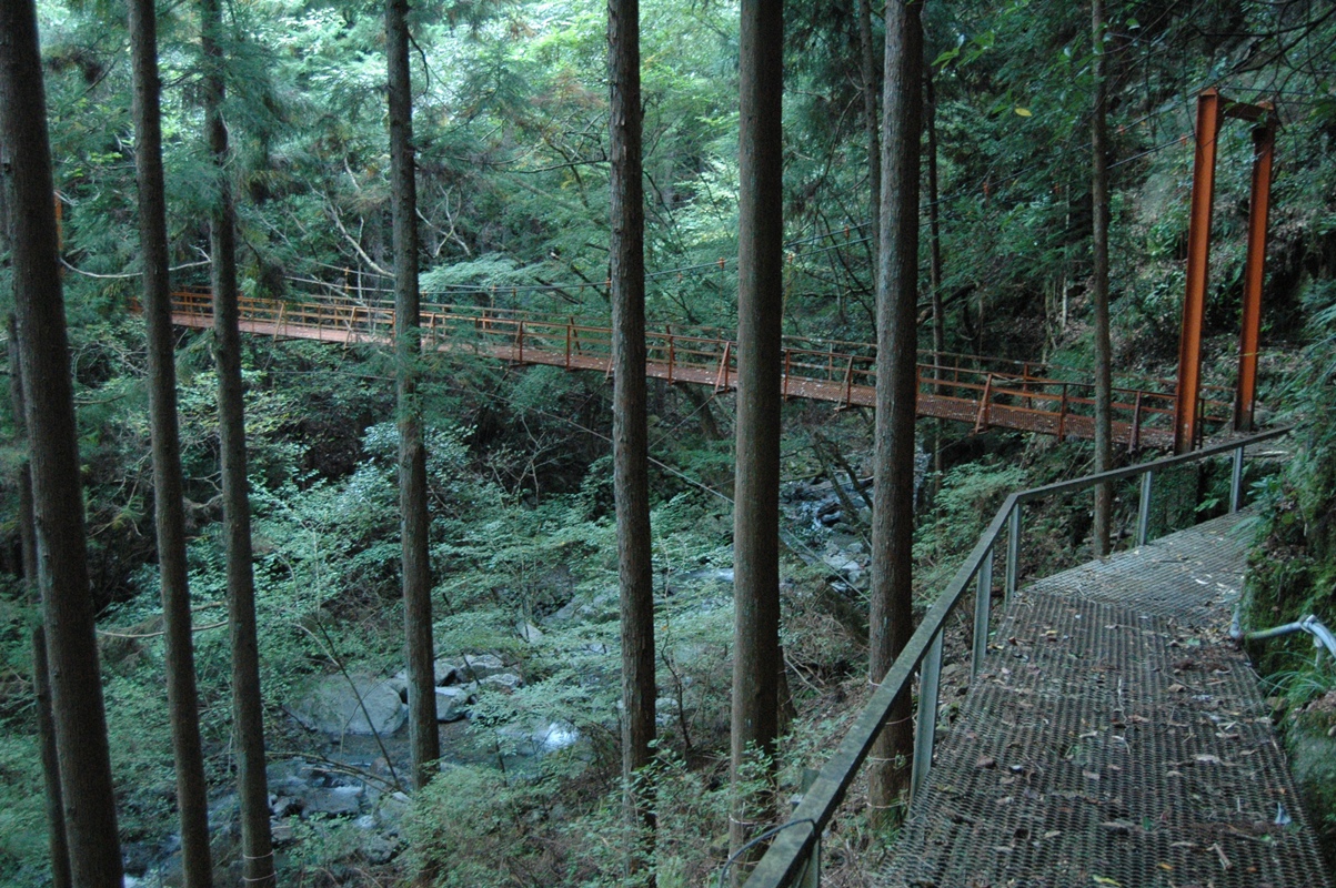 写真では出さないが上の写真、右方向に行けば、すぐ一軒の住宅がある。見たところ現在も居住されているようであったが定かではない。さらに鉄製の網で作られたような道というか、通路を進むと現れた吊橋。