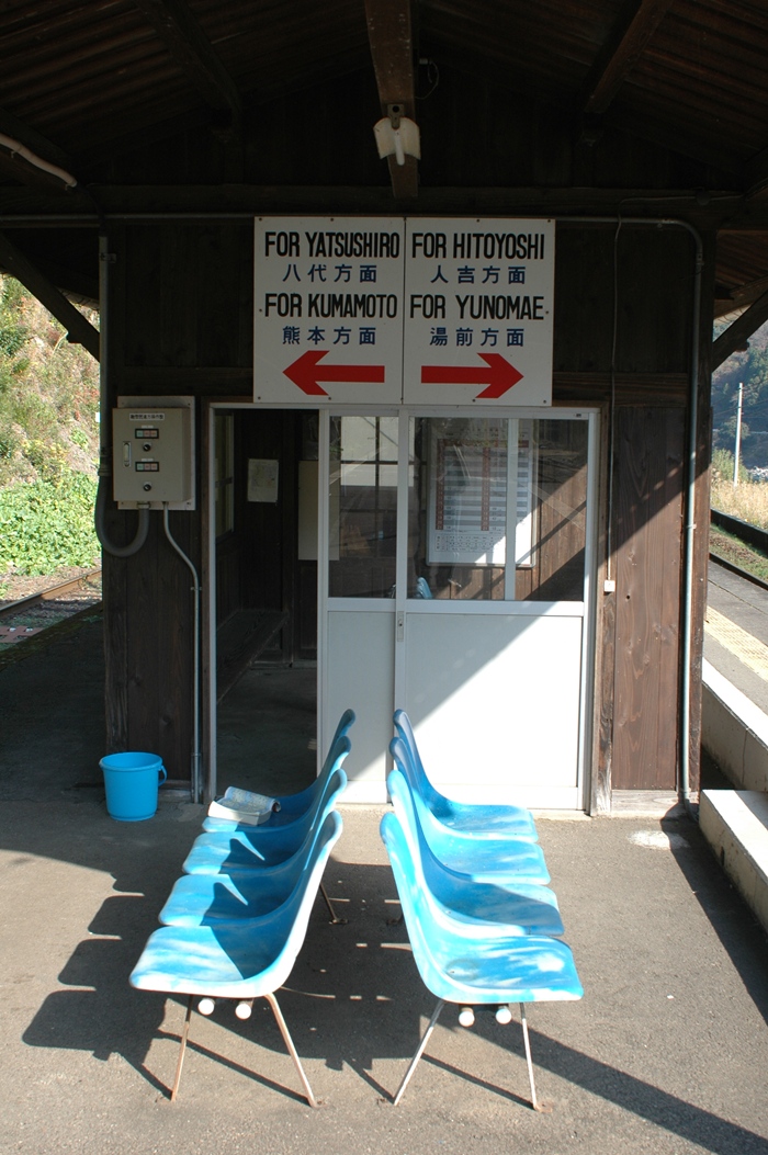 写真右側には球磨川が流れているのですが、このへんはまだ川幅があまり広くないのと、木があったりで待合室あたりからは川がよく見えません。