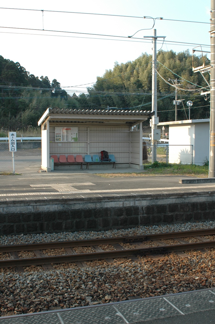 駅舎です。駅舎というか待合室ですね。コンクリート製でしょうか。横にあったトイレはつぶされいて物置状態でした。駅前の道路は県道のようです。時々車が通ります。散歩、ウォーキングの人も通ります。駅にはバイクや自転車がそこそこの数、駐輪されています。