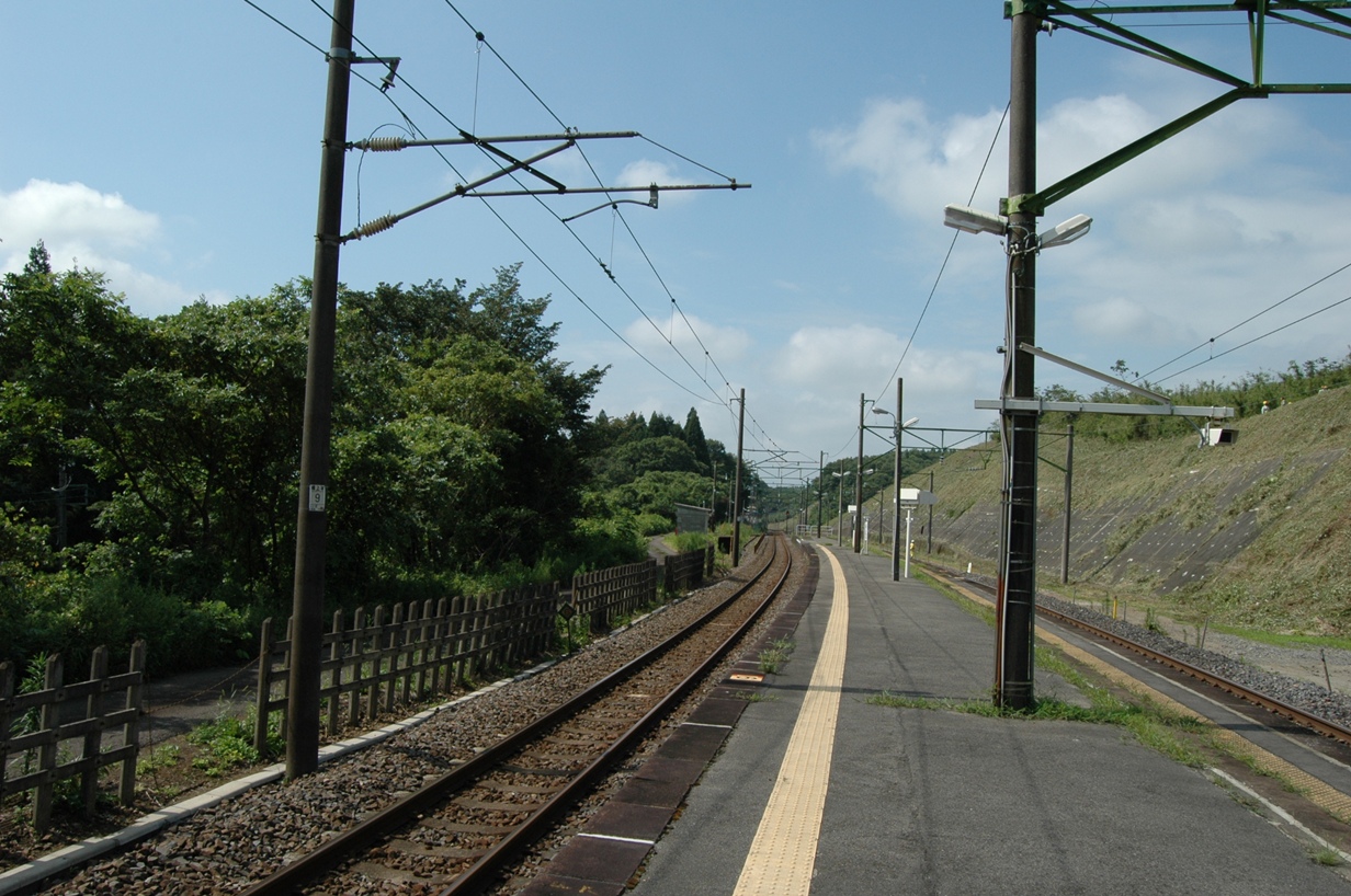 トンネルを抜けると線路の反対側に出られて、踏み切りになっていた。しかしこの踏み切りは渡れない。踏み切りの先は柵である。管理用の踏み切りなのだろう。踏み切り上から駅を撮ってみた。