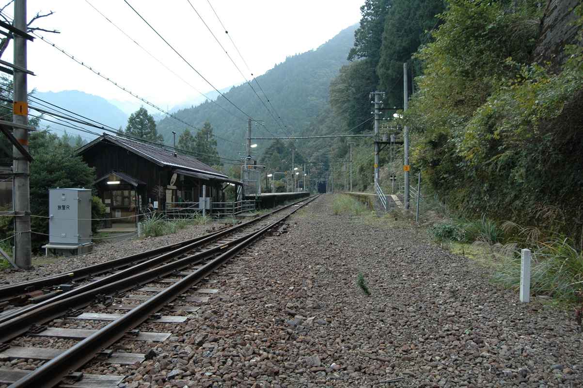 坪尻にて踏み切りを渡り、スイッチバック引込み線沿いに行いけば左側の谷には川が流れていると書いた。踏み切りをまっすぐいくと廃屋があり、そのそばに滝が見えるとも書いた。だが、そのまま行っても川には遭遇しないのである。はて?面妖な。 後に 国土地理院の地図(リンク)を見て仰天。実はこの鮎苦谷川、坪尻駅の平行部分は地下のトンネルというか、導水管を通っているのであった。しかもトンネルは2箇所あって、池田側トンネル(鉄道のトンネルね)の手前でまた導水トンネルに入り、線路の下をくぐっているのである。私が見た川はほんの百数十メートル見えている部分の一部だったわけだ。廃屋のそばで撮った滝の写真、あれはじつは上流側の導水トンネルの出口あたりなのだ。撮っている私の足の下を川は流れていたのである。たぶん。 調べてみると、坪尻は駅になるまえは列車交換のための信号場として作られたのだが、その際に作る場所がなく、川の流れを変えて、さらに川を埋め立ててつくったのだということであった。いやー、ご苦労な話です。 でだ、改めて「秘境駅へ行こう」の坪尻の項を見てみてば・・・・ちゃんとこのへんのことも記載されているではないか。お恥ずかしい。ぜんぜん記憶にありませんでした。 しかし、こうなるとその出口を是非見たいと思うのだが、見た人いませんかね。 |